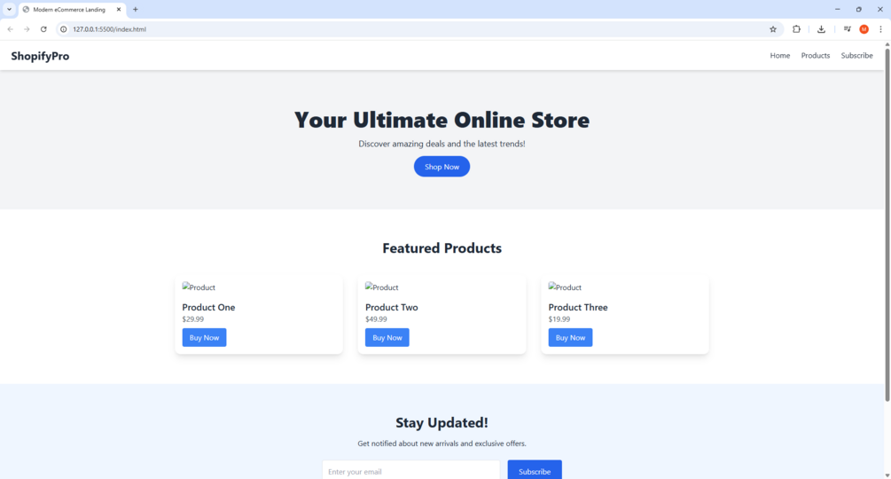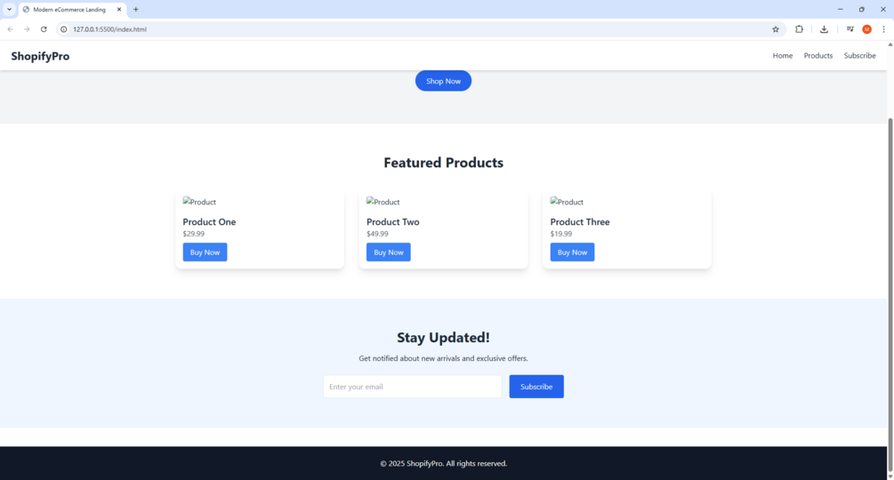 1 HTML file (index.html) 1 Tailwind-based CSS file (via CDN) Fully responsive landing page layout Hero section, product grid, and newsletter form Clean, well-organized code (easy to customize) Perfect for eCommerce, startups, and dev portfolios