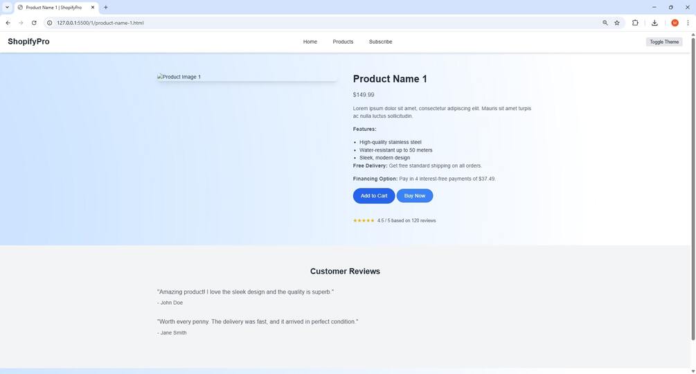 Fully Responsive Design: Optimized for desktop, tablet, and mobile devices. Smooth Theme Toggle: Easily switch between light and dark modes for a customized user experience. Liquid Animation Background: Attractive fluid animation effect in the background for a modern, dynamic feel. Easy to Customize: Built with Tailwind CSS, allowing quick and easy customization to match your brand. File Included: index.html, product-name-1.html, product-name-2.html, product-name-3.html - Individual product pages for easy setup.